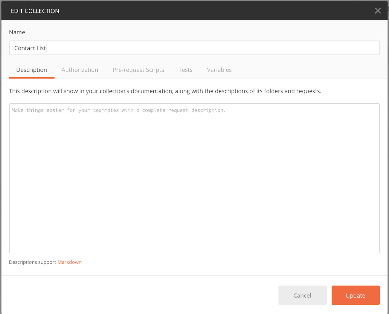 Notice that there are tabs for Authentication, Pre-request Scripts, Tests, and Variables. If I want to add a collection-level variable, I can simply click on the variables tab and enter in my variable name and value. We can do something similar to add an authorization token, a pre-request script, or a test.